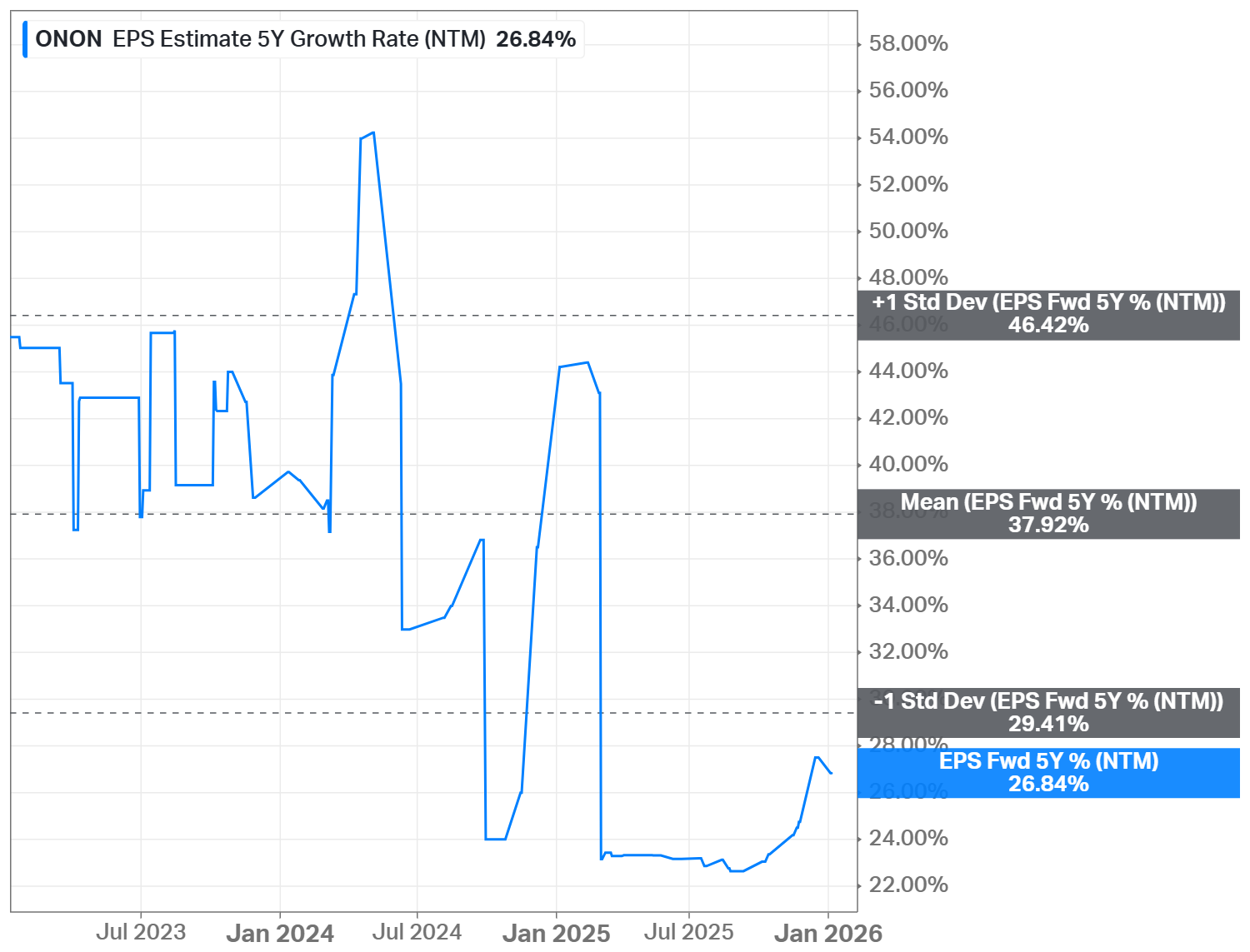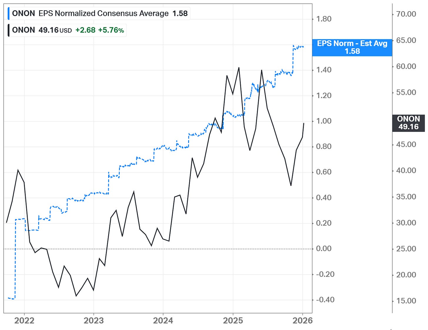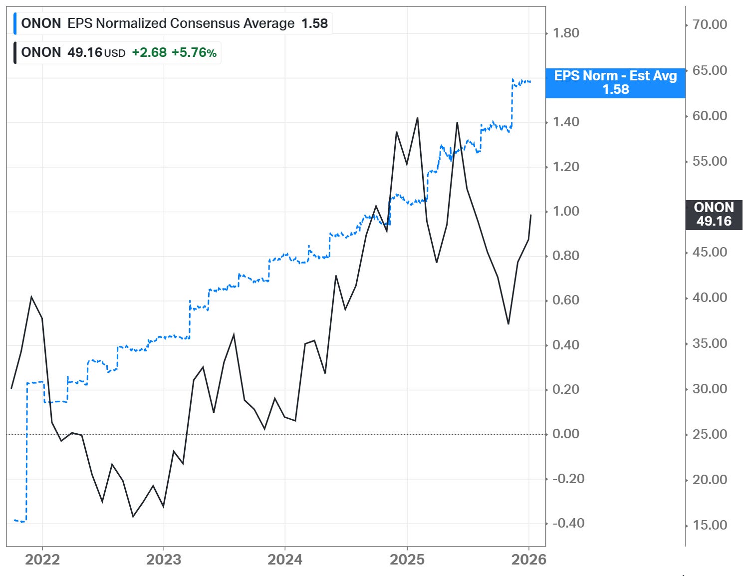 The Long-Term Pick’s Fair Price (Base Case) for ONON is $48.83. The current price of $49.12 is higher by less than 1%, so the stock is fairly valued.