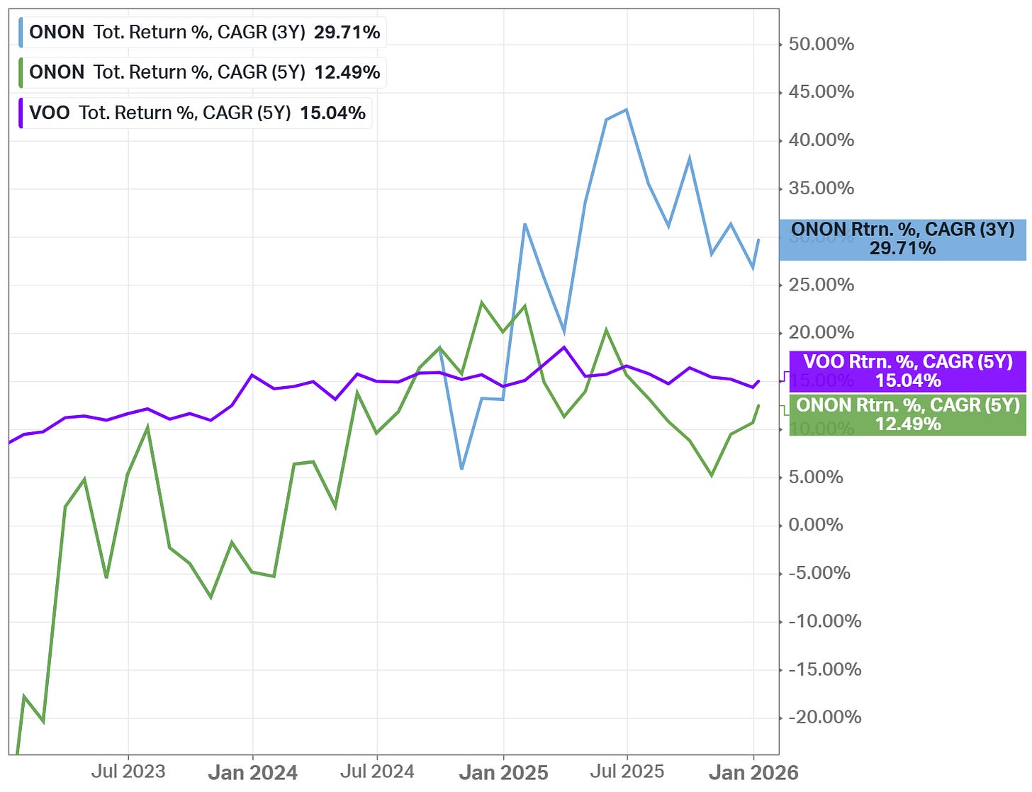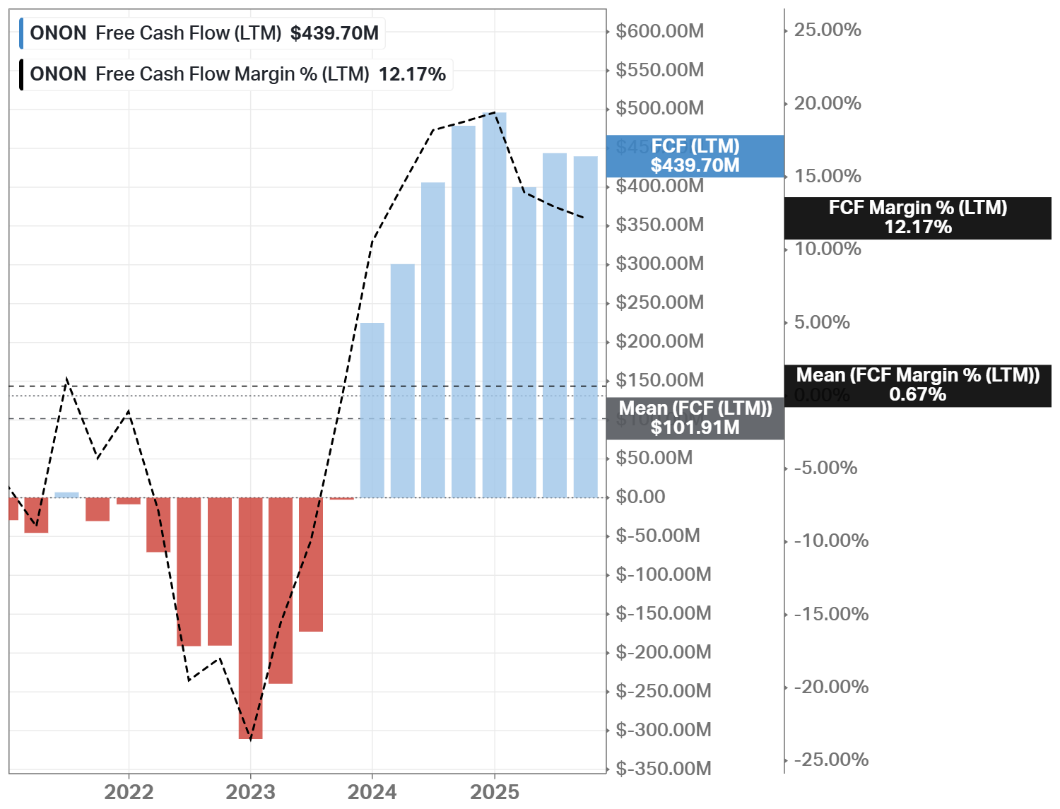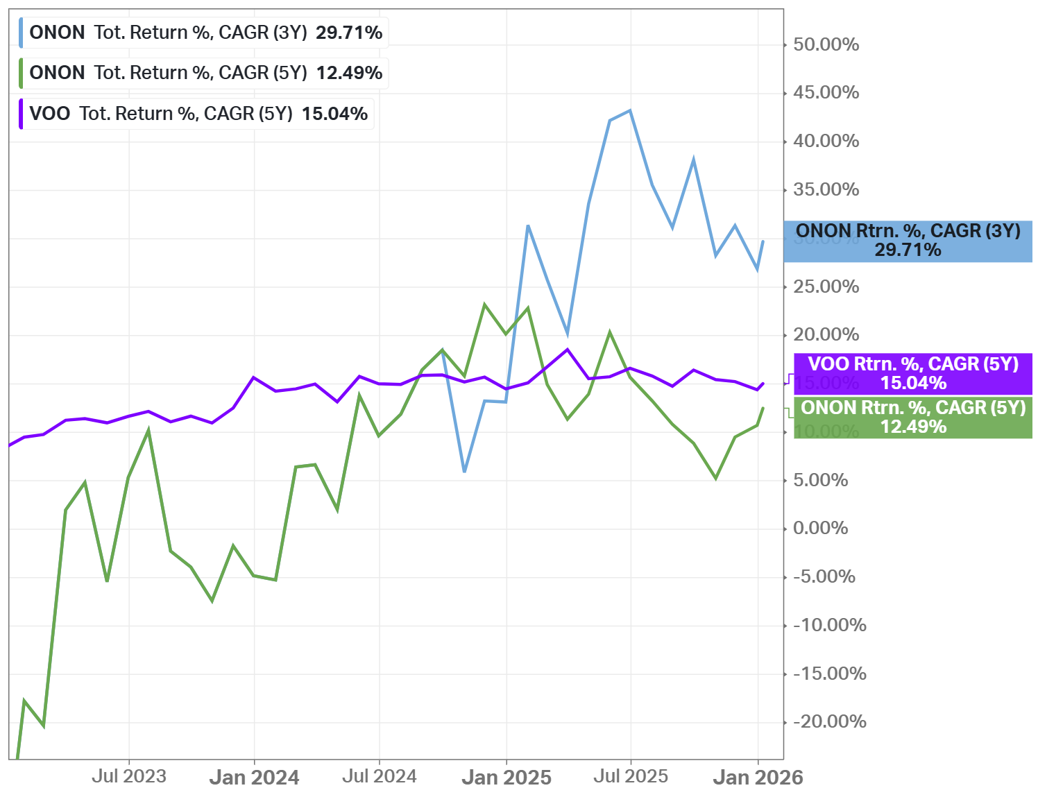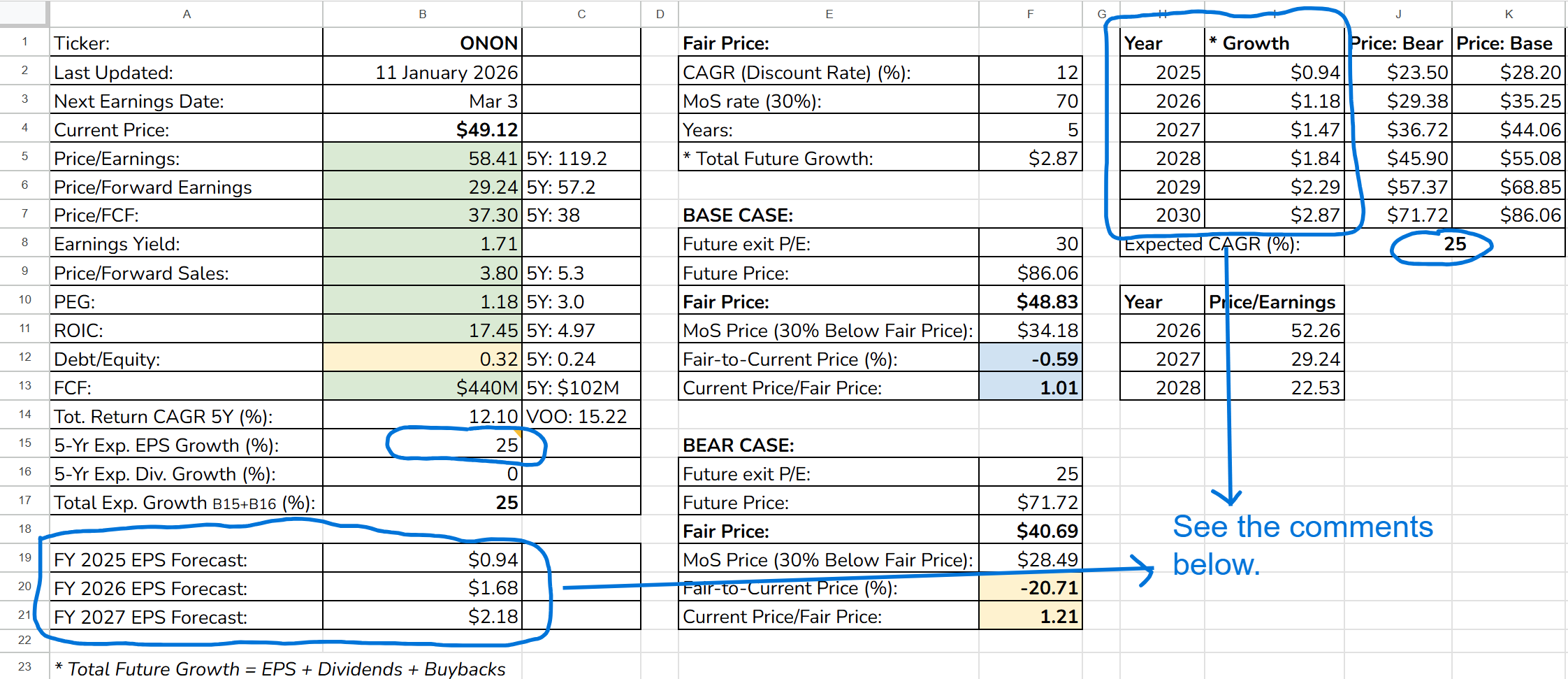 The Long-Term Pick’s Fair Price (Base Case) for ONON is $48.83. The current price of $49.12 is higher by less than 1%, so the stock is fairly valued.