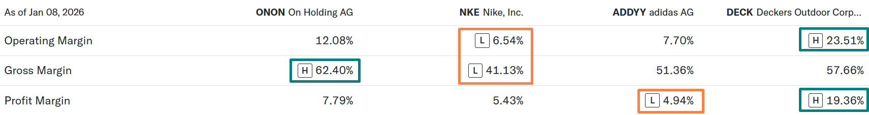 Lululemon Athletica (NASDAQ: LULU) overlaps mainly in premium apparel rather than footwear. While Lululemon has strong brand loyalty, On’s footwear-led ecosystem and technical credibility create differentiation as apparel expands.
