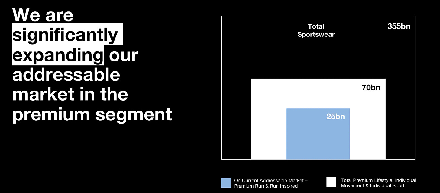 According to the presentation, On’s addressable market (premium segment) is about $25 billion. The total global sportswear is shown at approximately $355 billion, while the broader premium lifestyle, individual movement, and individual sport segment is estimated at around $70 billion.