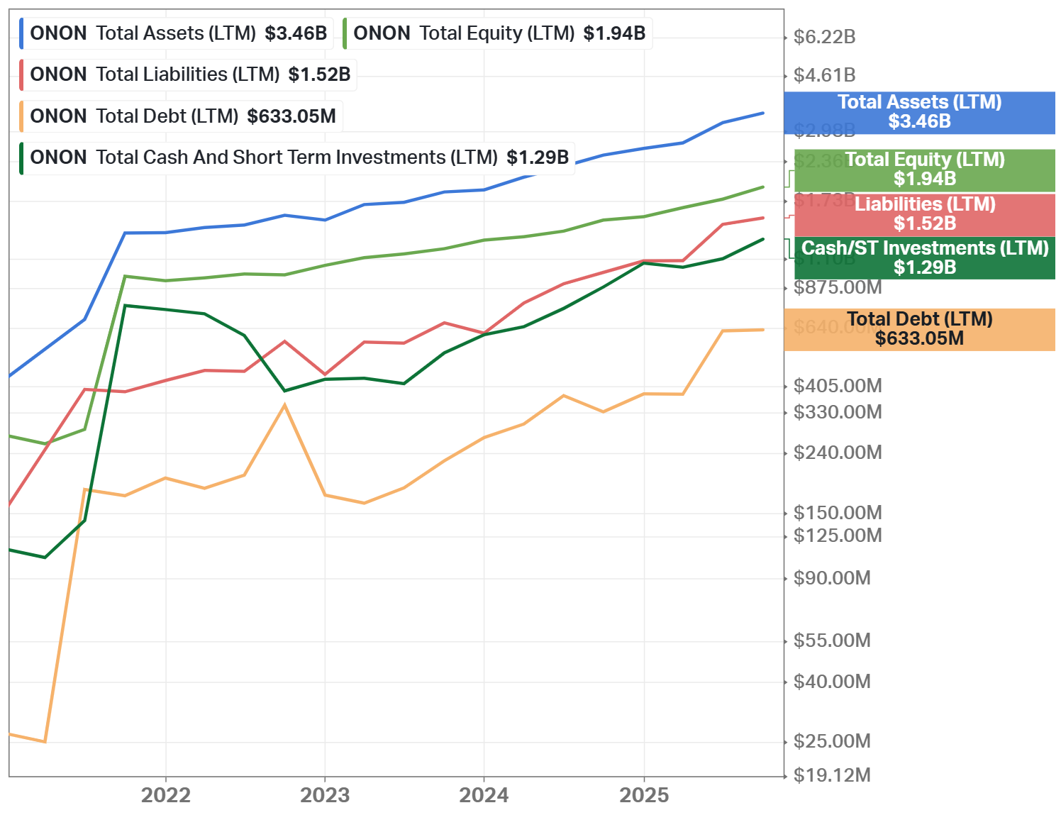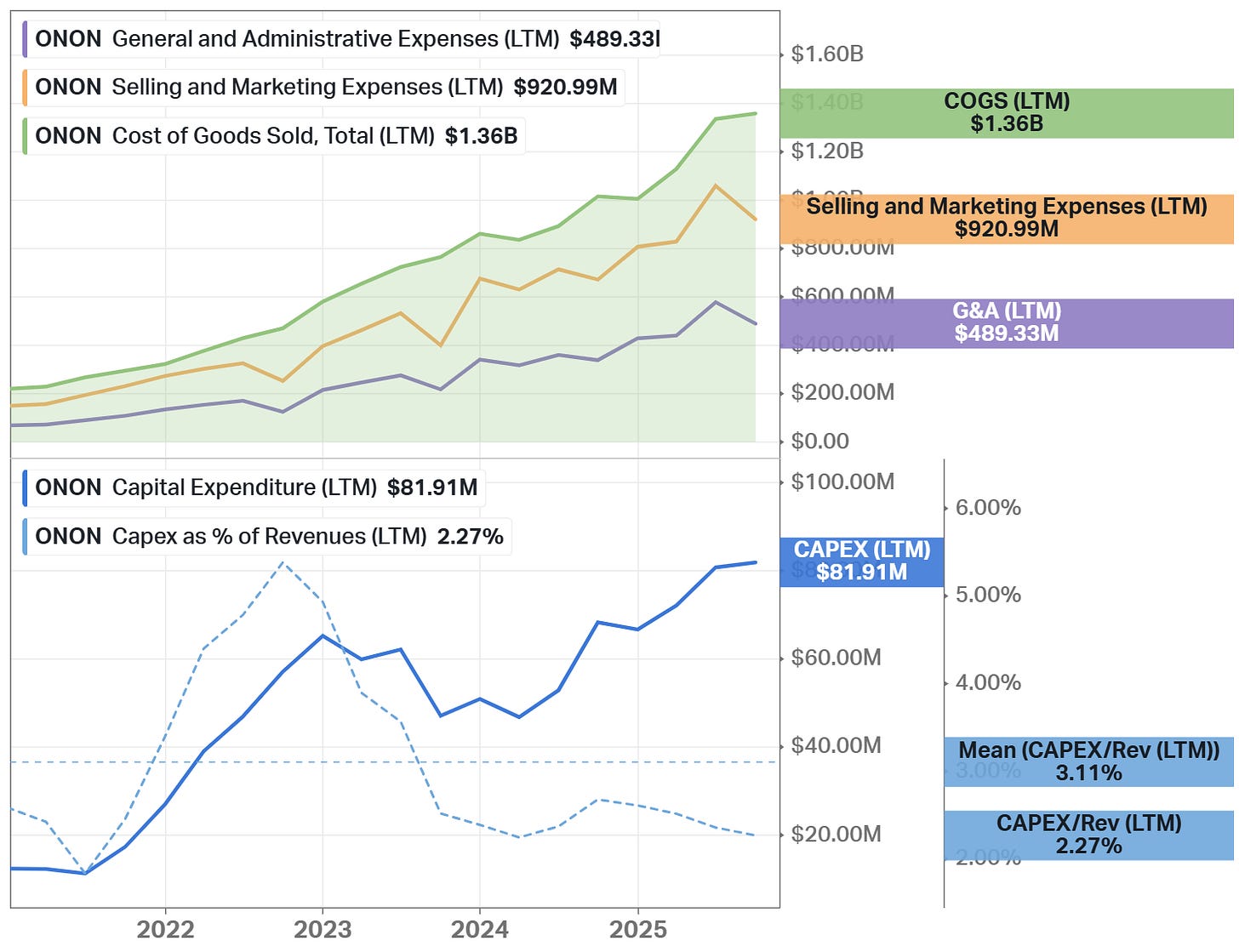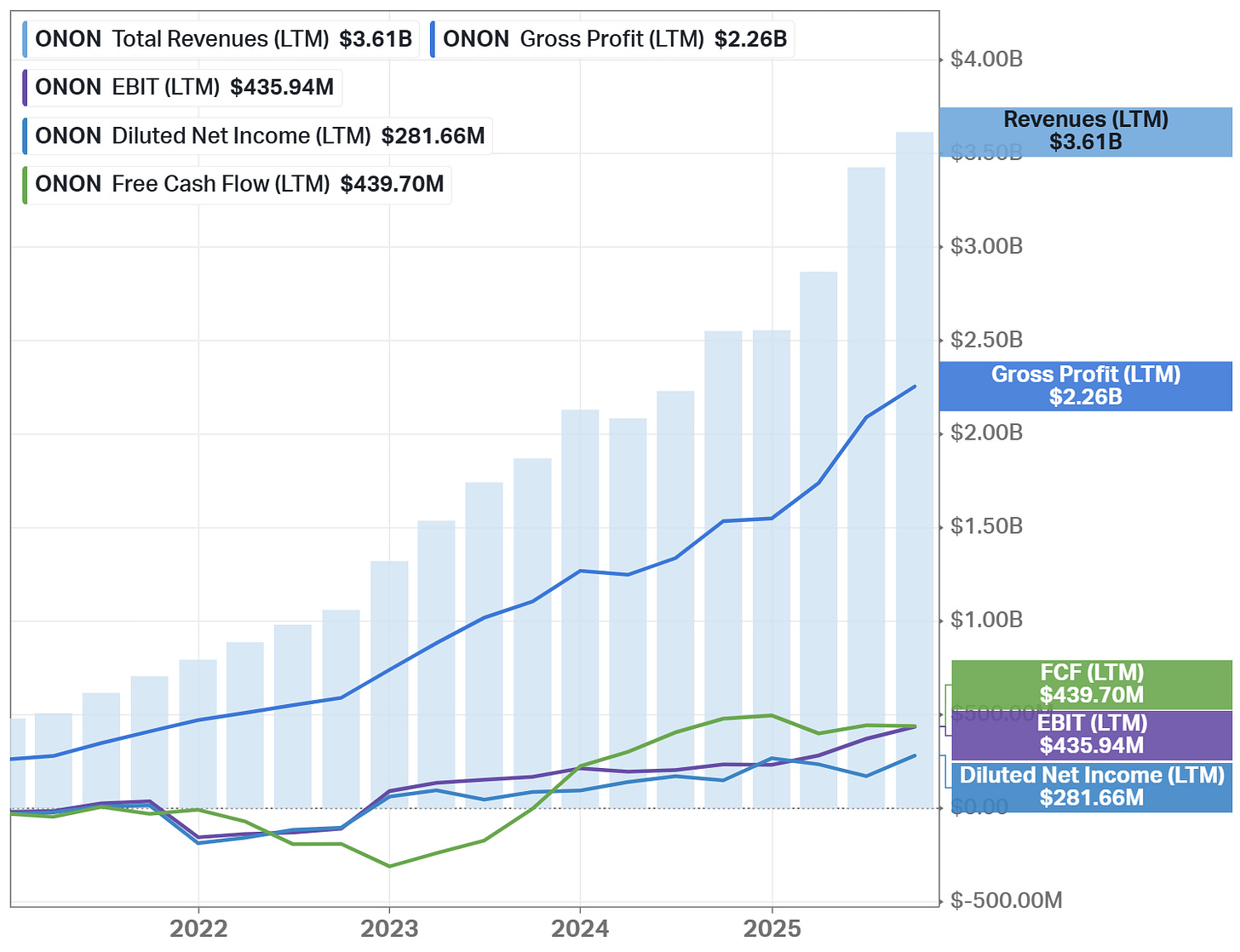 On Holding AG (NYSE: ONON) is a Swiss premium sportswear company founded in 2010 by former professional triathlete Olivier Bernhard, together with David Allemann and Caspar Coppetti. The company was built around proprietary CloudTec® cushioning technology, designed to reduce impact and improve running efficiency. On focuses primarily on performance footwear while steadily expanding into premium apparel and accessories (representing approximately 7% of total revenue) to build a complete sportswear ecosystem.