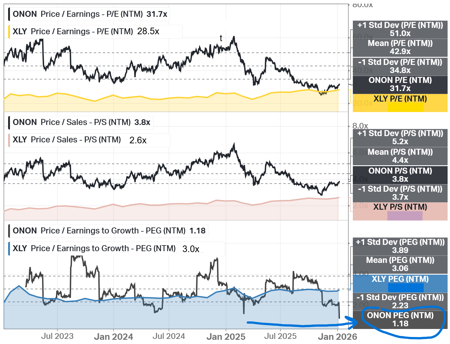 On Holding presents an attractive long-term entry point as the stock trades below its three-year average valuation and near my fair price estimate, offering a margin of safety for a premium growth business. At the same time, the PEG ratio of 1.18 indicates that the current valuation remains reasonable relative to expected earnings growth.
