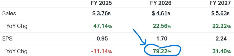 Below is the 3-year forecast for future sales and EPS growth. Pay attention to the EPS growth rebound in FY 2026 and the high value in FY 2027.