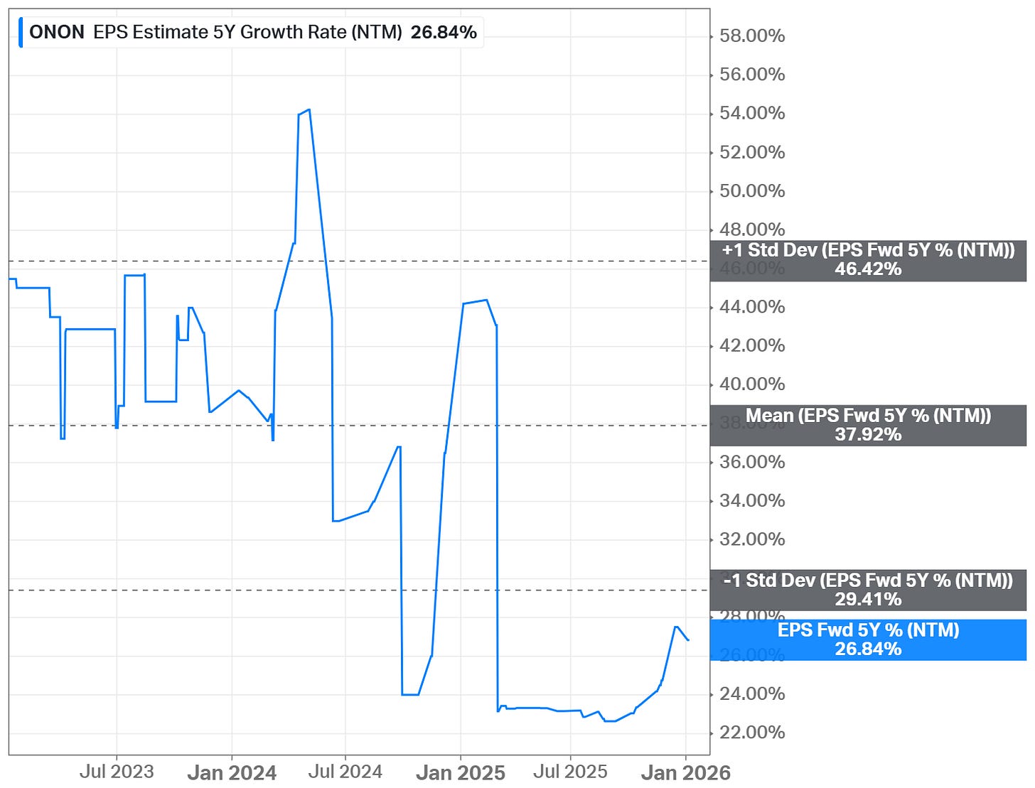 Usually, my maximum 5-Yr Expected EPS Growth value is 20, so even if a stock has more than this value, I always set 20. In the case of On, I used 25, since with my default value of 20, there would be a big gap in future EPS representation year-over-year (the right part in the screenshot above). Even with a value of 25, pay attention that my future EPS projection (the right part in the screenshot above) is still below the levels for the next three financial years (the left part in the screenshot above).