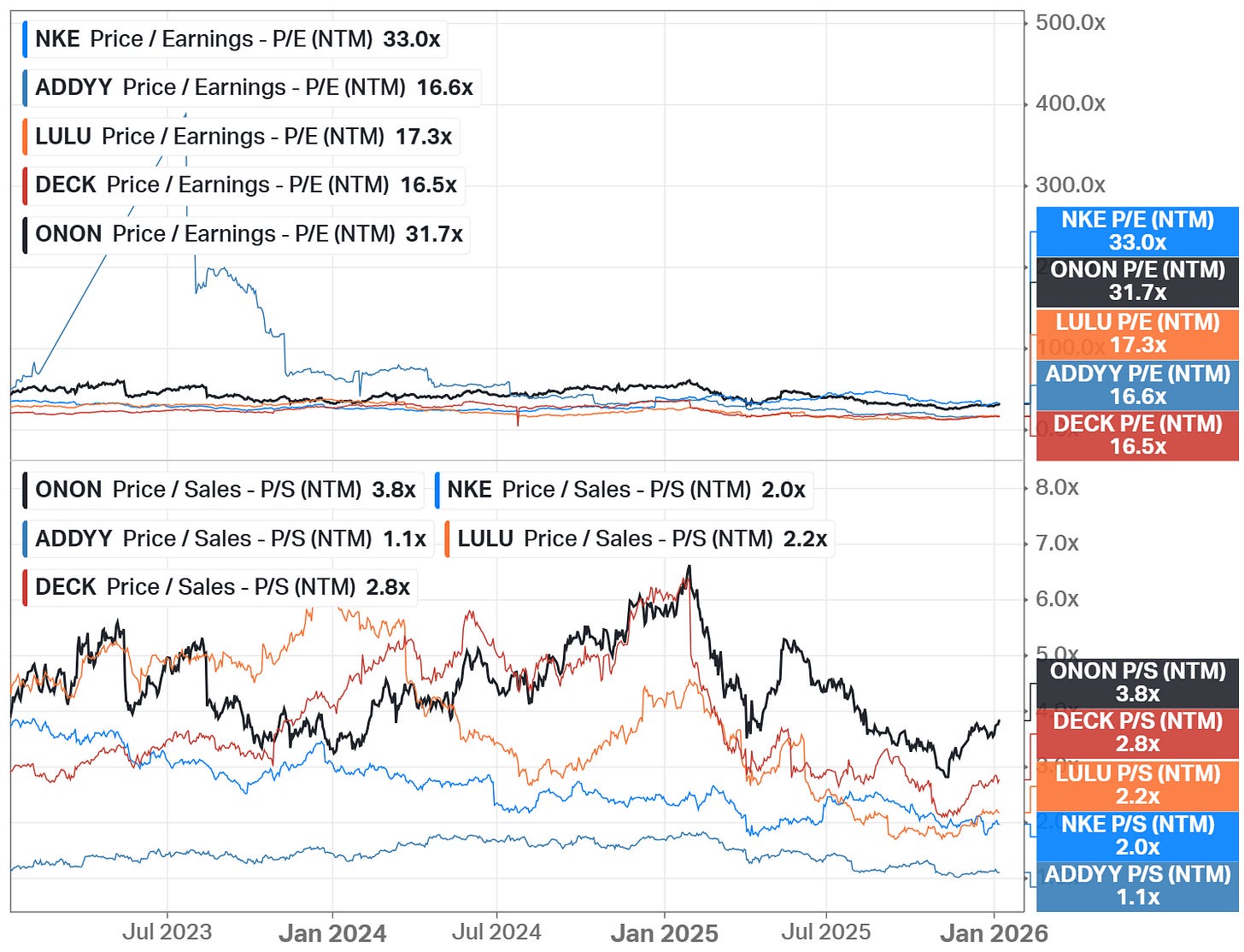 Adidas (ADS.DE, OTC: ADDYY) competes directly in performance footwear and apparel. Adidas benefits from global scale, but On differentiates through proprietary technology and stronger pricing power in the premium segment.