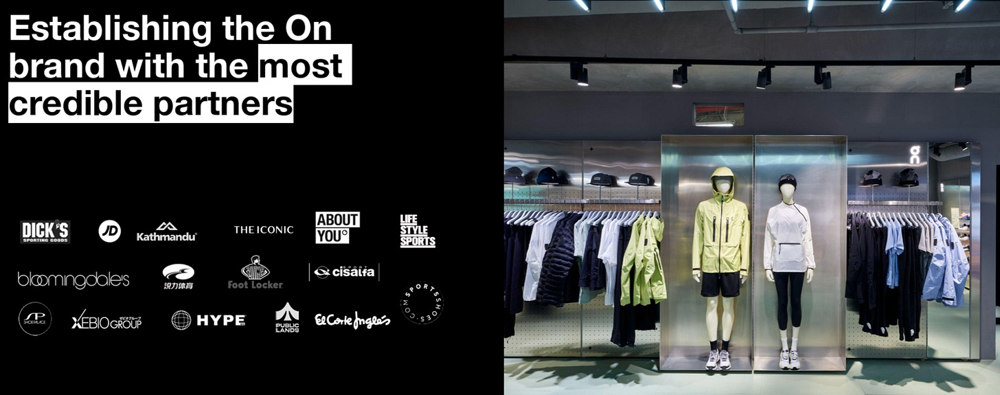 On sells its products in more than 80 countries through a balanced mix of direct-to-consumer (DTO) and wholesale channels. This hybrid model allows the company to control brand experience while reaching global scale. The company operates flagship and brand stores in cities such as Zurich, New York, Tokyo, and Palo Alto, which serve as both retail and marketing hubs.