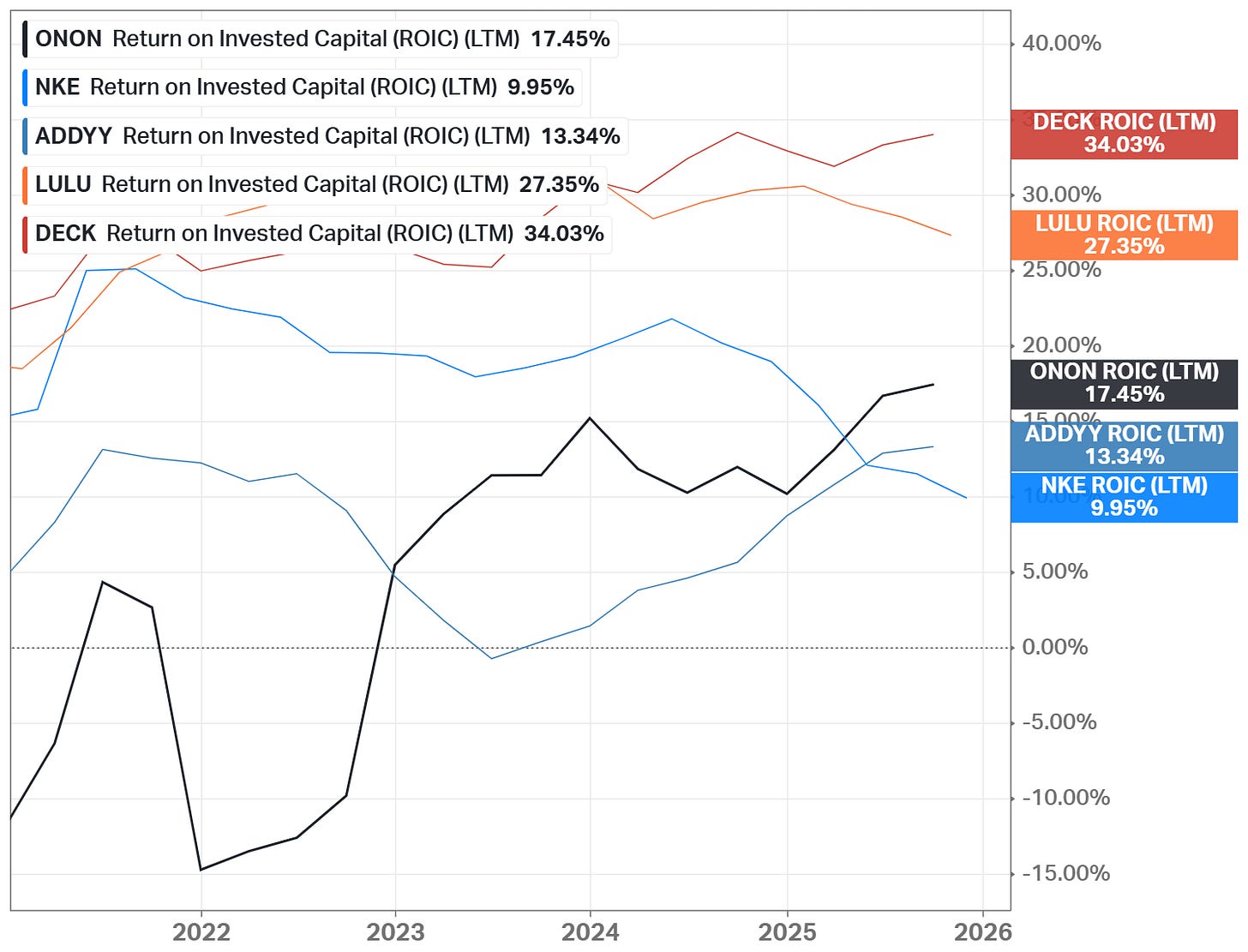 On’s gross margin above 60%, the highest among its main competitors, reflects premium positioning, pricing power, and strong brand equity. Improving operating efficiency is further visible in the rising return on invested capital, which increased materially over the past three years. This combination shows that growth is becoming more profitable rather than more capital-intensive.