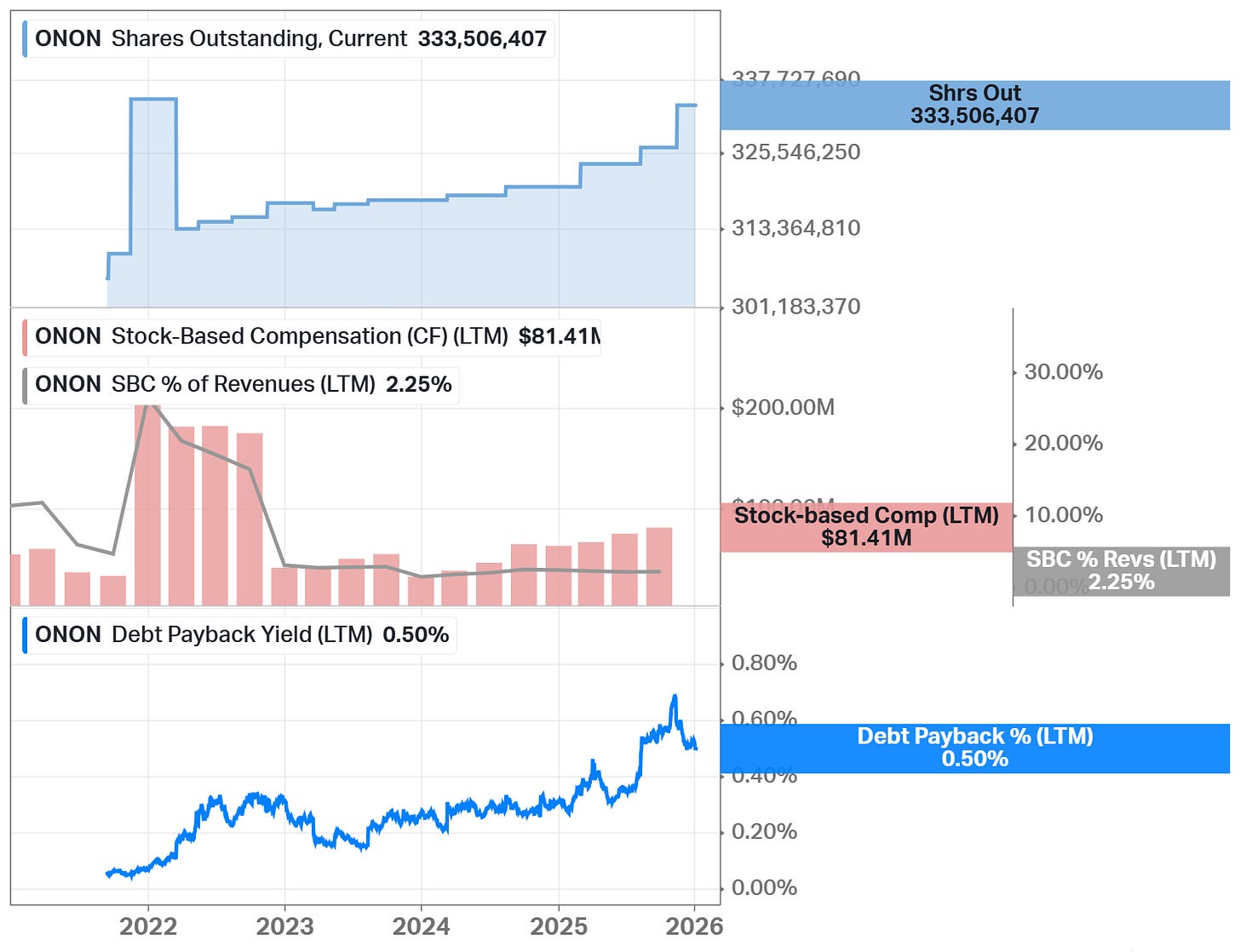 On has not engaged in share buyback activity and does not pay dividends. The company is currently focused on growth rather than returning capital to shareholders.