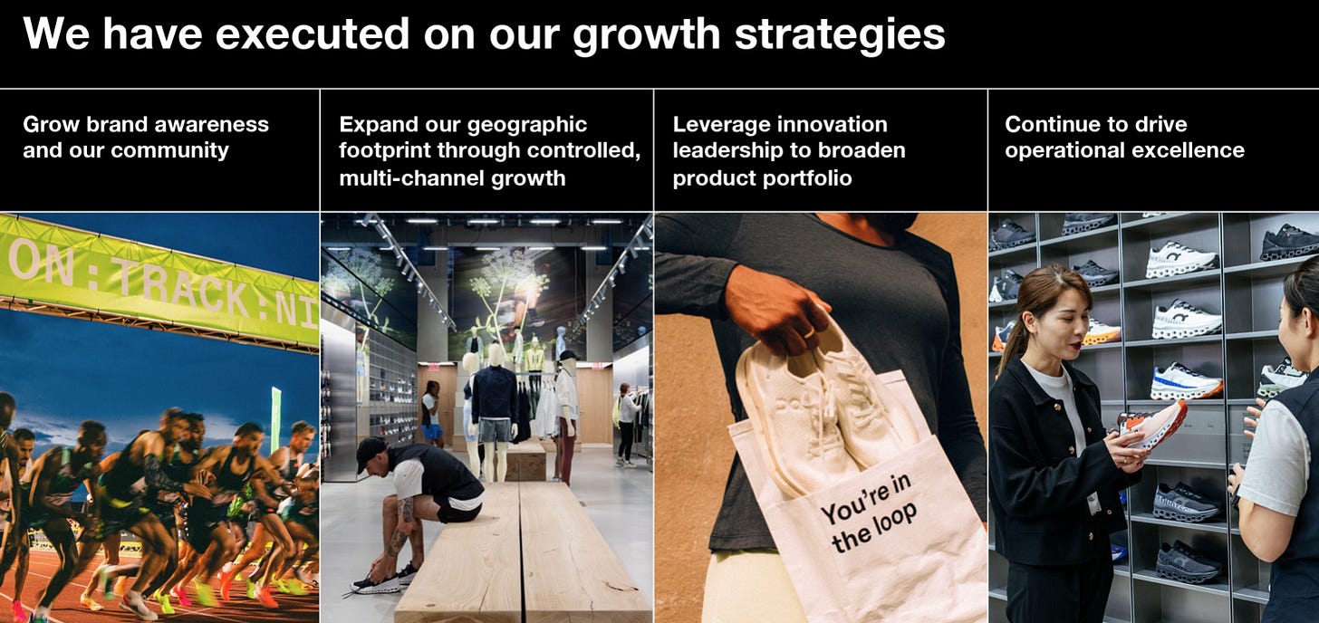 On’s strategy focuses on premium positioning, innovation-led growth, and global expansion. Footwear remains the core of the business, while apparel and accessories are scaled to increase customer lifetime value and reduce reliance on a single category.