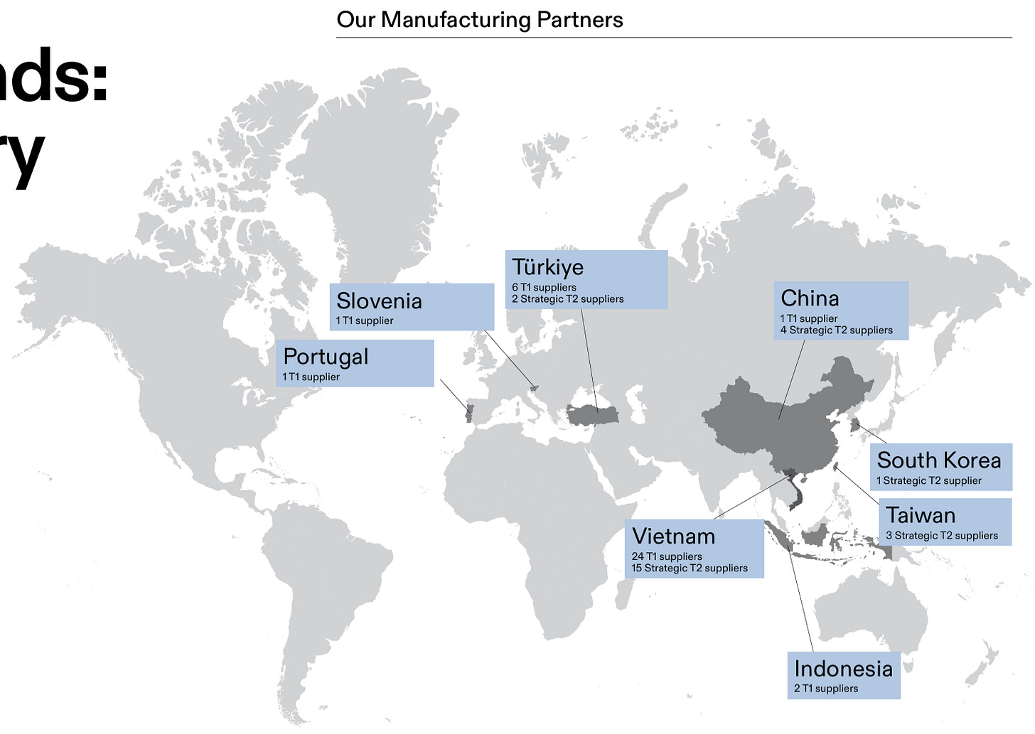 Manufacturing is outsourced to third-party partners (primarily in Vietnam and China), while product design, R&D, and quality control remain in-house.
