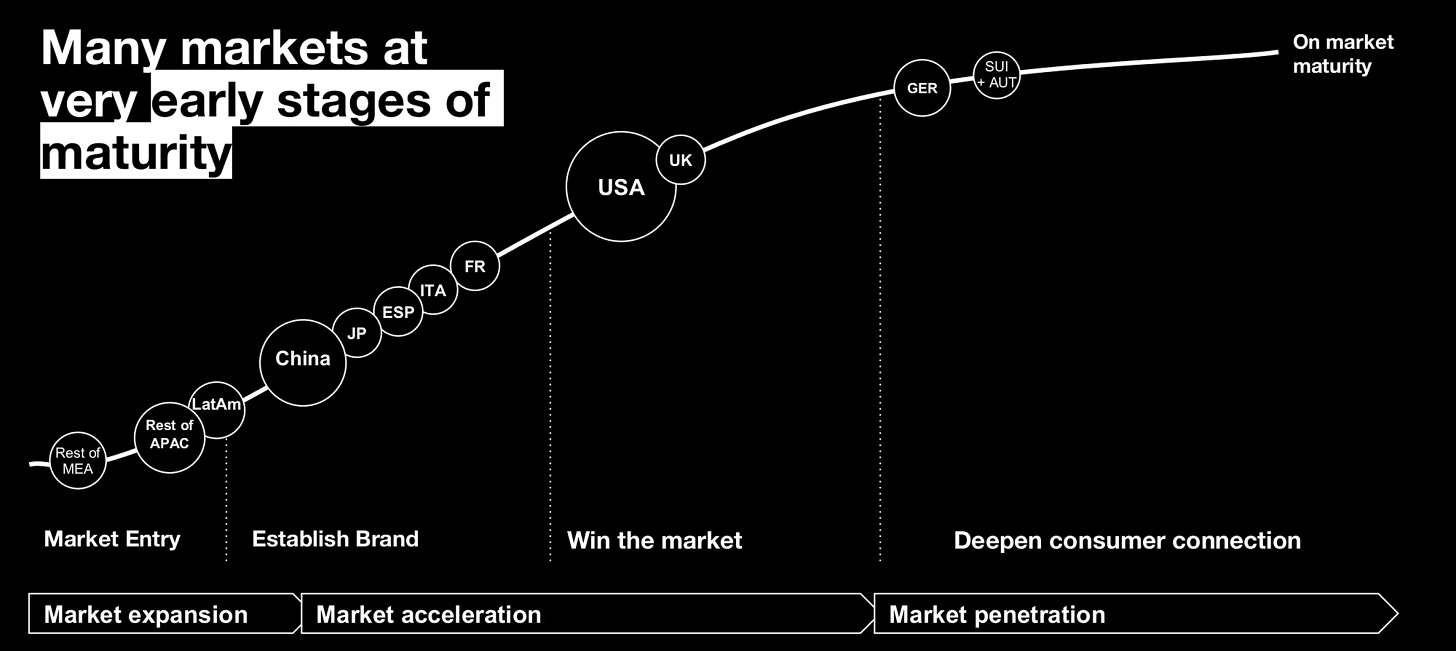 According to On’s presentation (PDF), they are still at an early stage of market maturity in many regions. Markets such as China, Japan, Southern Europe, Latin America, and parts of Asia-Pacific are shown in the early phases of brand establishment and market acceleration. Even in the United States, which is On’s largest market today, the brand is positioned in the “win the market” phase rather than full maturity. This indicates that On’s current revenue base reflects partial penetration, with significant room to grow through deeper consumer connection, broader distribution, and repeat purchases over time.